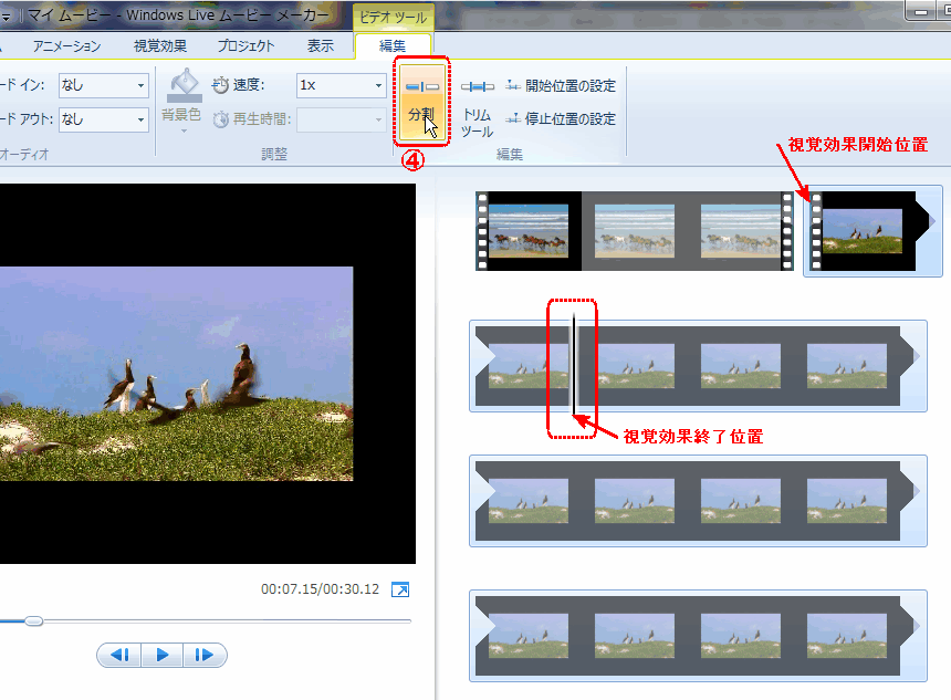次に 視覚効果の終了位置で再び再生を一旦停止しておいて、もう一度「分割」ボタンを押す(④)。