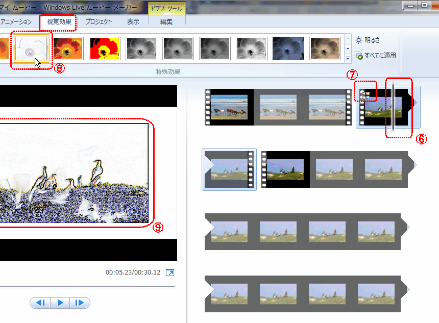ビデオが 3つに分割されたので、視覚効果を適用したいクリップの上にスライダーを持って行き(⑥)