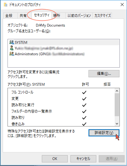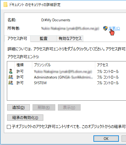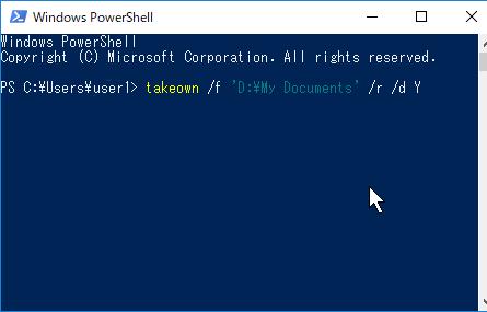 フォルダー名はスペースを含む場合 シングルクォーテーションかダブルクォーテーションで囲む。成功: ファイル (またはフォルダー): "D:\My Documents\xxx\yyy" は現在ユーザー "Desktop\User1" によって所有されています。