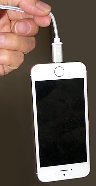実際に使ってみるとマグネットは意外と強力で、まっすぐ引っ張ったら コネクタのほうが抜けてしまうものもあるくらい吸着力がある。写真3のようにケーブルを持ってスマホを下に向けてぶら下げても通常のスマホなら外れない。勿論振れば落下するので万が一充電中に机から落下させたりすると外れる可能性が高い。外す時は水平方向に折り曲げるようにして外すのがコツ。そうしないとスマホ本体から USBコネクタが抜けてしまう場合もあって本来の目的を果たせない。