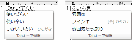 例えば、下の左側のように「つかいづらい」と打つべきところを「つかいずらい」と間違えても何事もなかったかのように正しい候補を表示してくれる。これはある意味ありがたいが、右のように「ふいんき」(「ふんいき」ではない)と入力すると、何と「雰囲気」と修正して候補を表示してくれる。しかも「フインキ」というそのままの候補よりも順位は高い。