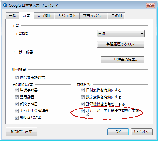 ただし、この機能は設定で切り替えられる。IMEバーの スパナマークをクリックして「プロパティ」を開き、「辞書」タブを開いたら右下の「もしかして機能を有効にする」のチェックを外せば、こうした「余計なお節介」をオフすることができる。
