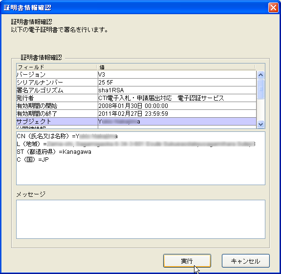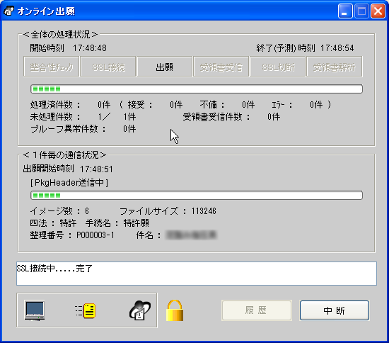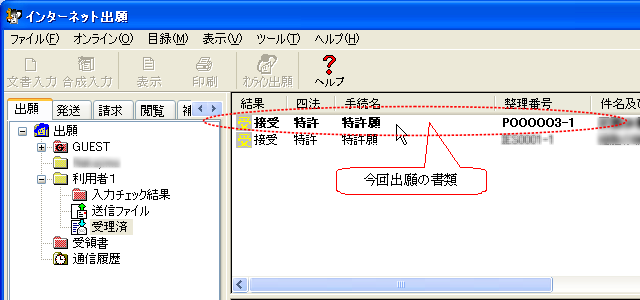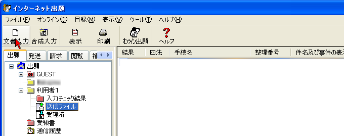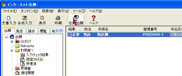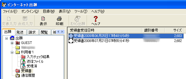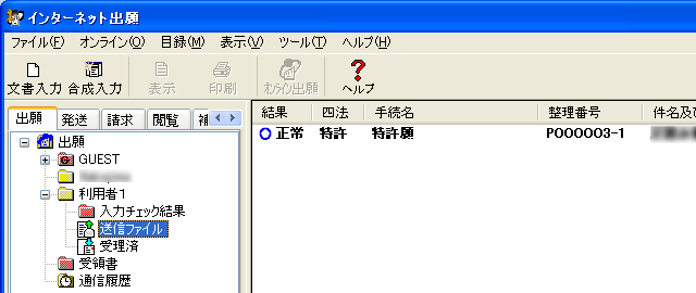 HTMLフォーマットで出願書類と図面などが準備できたら、インターネット出願ソフトに「文書入力」します。 インターネット出願ソフトのルートフォルダ(標準は C:\JPODATA )の下に、「出願用」などの適当なフォルダーを作成します。そしてそこに作成した出願用ファイルを全てコピーします。(出願書類は一応HTMLフォーマットで、図面など別ファイルはリンクがかかっていますので、予め同一フォルダーで作成しておかないと、エラーになる可能性があります。) ![]() まず、「出願」タブで「送信ファイル」を選択します。すると上の「文書入力」というボタンがアクティブになってクリックできます。 ここをクリックすると出願ファイルの参照ウィンドウが開きますので、先ほどコピーしたフォルダーの出願ファイルを選択して「指定完了」ボタンを押します。 ![]() インストールされている電子証明書(電子的なハンコのようなもので本人であることを証明する)で署名(暗号化)をするための確認画面が表示されます。実行ボタンを押すと書類の形式チェックも同時に行われます(数十秒)。 ![]() 署名・チェックが終わると以下のようなウィンドウにチェック結果が表示されます。 ![]() もし上図の赤丸内のようにエラーや警告があったら「入力チェック結果表示」ボタンを押すとエラーや警告内容が表示されます。下の図はチェックの結果で図面をモノクロで作成しなかったため警告が出たことを示しています。 ![]() エラーは修正しないとファイルが送信トレーに入らず送信できません。警告はそのままでも送信できますが、文字数が推奨の字数に入らないなどの警告なら無視しても構いませんが上記のような図面にかかわる警告などは自動で減色されると意図が伝わらない可能性があるので、なるべく自分で訂正した方が良さそうです。(グレーの濃さで領域の違いを表現していたりする場合、ハッチングの向きや密度で領域を塗りなおした方が明快です) エラーや警告が出なくなるまで上記文書入力作業を繰り返します。私が遭遇した若干のエラー対処の仕方はこちら。特にエラーや警告がなければ以下のような表示になります。 ![]() 念のために「入力結果表示」を押すと今度は「正常に処理されました」となりました。 ![]() これでやっと該当の「特許願い」を選択すると「オンライン出願」ボタンがアクティブになって押せます。 ![]() 「オンライン出願」ボタンを押すと送信確認ウィンドウが表示されます。 ![]() 「OK」ボタンを押せば 特許庁にSSL(暗号化)接続して送信が始ります。文書や図面のサイズによりますが、ADSL以上だったら 2-3分で送信が完了します。 ![]() 無事送信が終われば、以下のような表示が出ます。 ![]() 受理済みフォルダーの中は「接受」という結果が表示されます。 ![]() 「受領書」フォルダーの中を確かめると、確かに今回の出願の日時で受領書があります。 ![]() 7.チェックでエラーが出る場合の対処