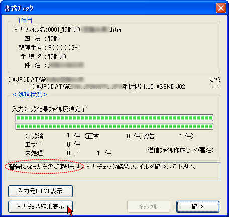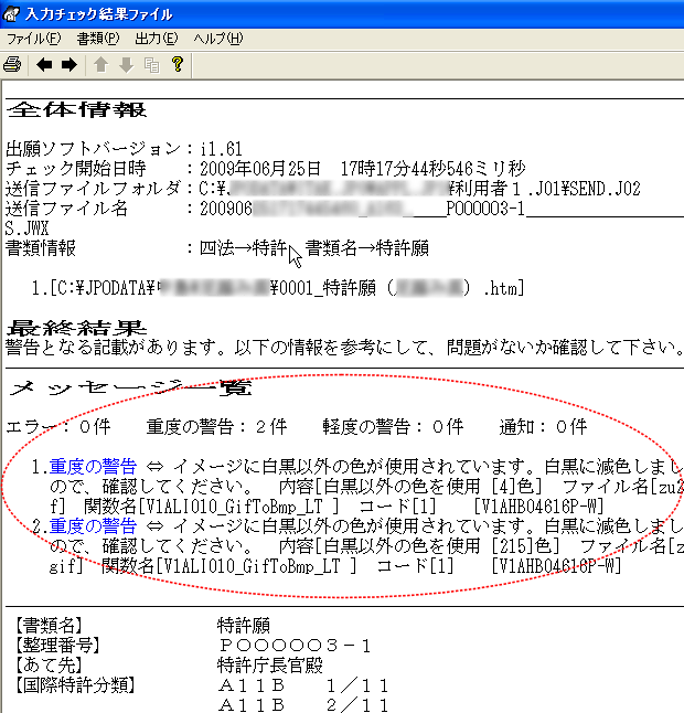 作成結果の出願書類を、上記のように出願前にインターネット出願ソフトでチェックして、少なくともエラーが出たら修正しないと出願できません。警告が出ることもありますが、警告は無視しても出願は出来るのに対して、エラーがある場合はファイルが送付トレーに入らずに、出願ボタンが押せません。