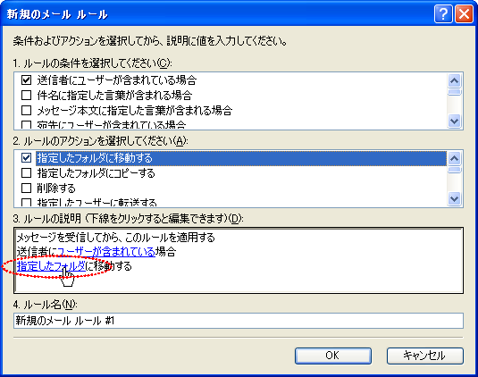 「新規のメールルール」に戻るので、3.の「指定したフォルダに移動する」のリンクをクリックする。