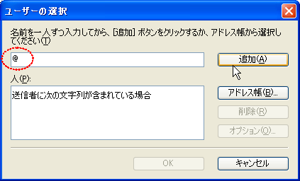 下の図のように「ユーザの選択」ウィンドウで上の欄に「@」を入力し「追加」ボタンを押す。