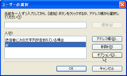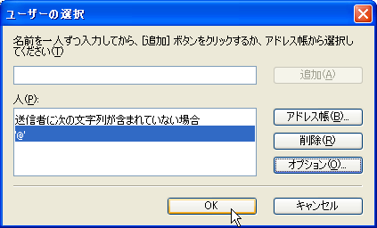 「人」の欄が「送信者に次の文字列が含まれていない場合」「'@'」となっていることを確認して、「OK」ボタンを押す