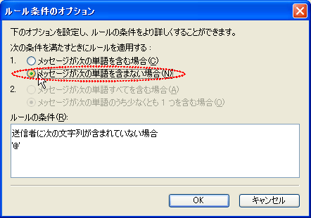 1.から「メッセージが次の単語を含まない場合」の方を選んで、下の「OK」ボタンを押す。
