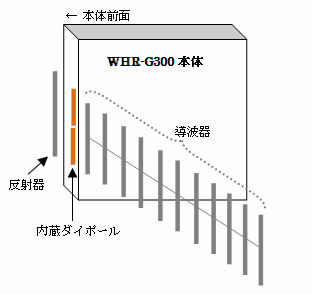なお、図の筐体内のダイポールアンテナの位置に関する数値は私の所有する WHR-G300Nを分解して測定したもので正確さは保証しません。参考程度として下さい。