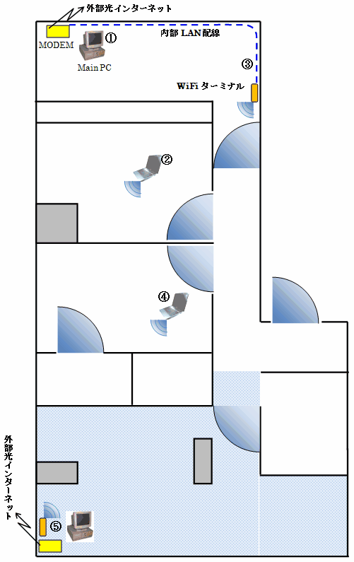 元々、一番北の端の部屋で私が PCを使っていたのでこの部屋に MODEMを置いていたが、冬の間、この部屋では PC作業が寒いので、床暖もあり朝一番~夕暮れまで燦々と日の当たる南側のリビングにPCラックを移した。それに伴い、インターネットモデムも PCと一緒に移動させ 元々右図の ③の場所にあった WiFiターミナルもリビングの ⑤の位置で PCラックの上に設置することに。