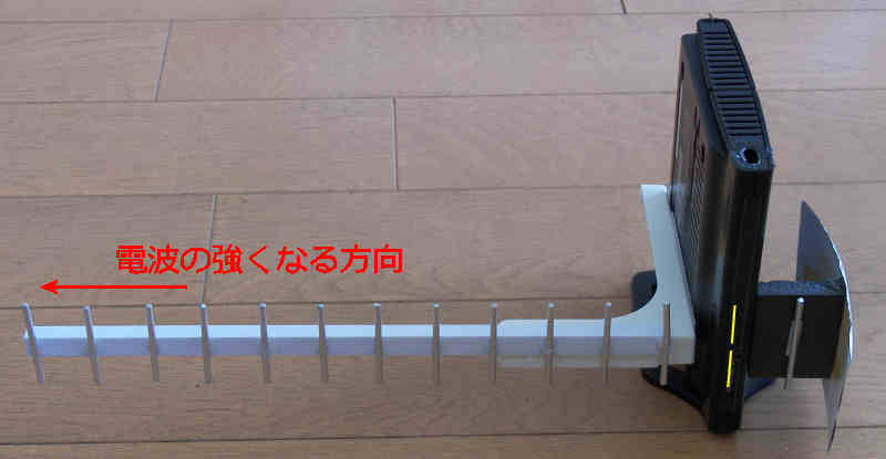 気を良くして、さらにエレメント数を増やしたら別の部屋での受信感度が増すかも?と思って、上の写真の先に別のバー状の部材をくっつけて 6エレメントを足してみたが、残念ながら別の部屋ではそれほど受信強度は上がらなかったが、アンテナのわずかの方向の違いによって強度が変わり予想通り廊下のドアの辺りに向けた時が最大になった。自由空間ではない反射物や遮蔽物がある家の中ではある程度広い範囲に放射された電波が複雑に反射しながら伝搬するので、表面の平坦な金属板(反射板)でも壁にない限り極端に指向性を鋭くしても到達距離はそれほど変わらないのだろう。