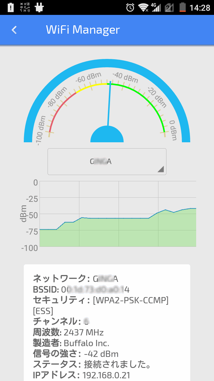測定はスマホの WiFi強度測定アプリを使用。家の中を歩きまわったり、アンテナの向き変えるとグラフ表示もされて便利。プロトコル解析機能付き簡易電界強度計と考えるとスマホ恐るべし!! この表示を信ずるなら接続できていれば 70Mbps以上の通信速度が得られているようだ。