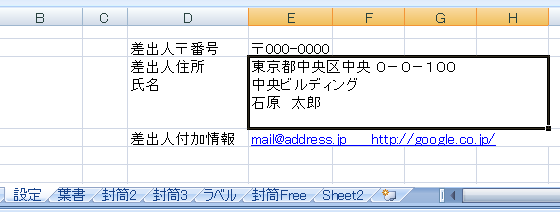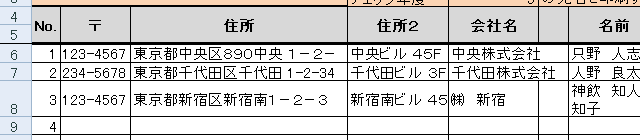 一番上のシート「住所録」の6行目以降に、郵便番号や住所、会社名、氏名など必要なデータを入力します。