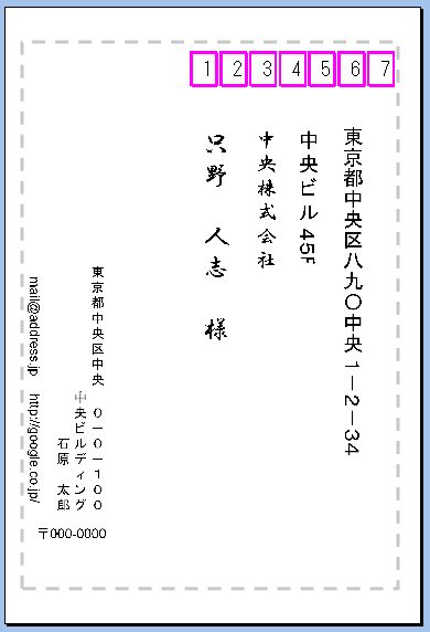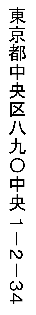 右の図は、「東京都中央区890中央■1-2-34」と「中央」と「1-2-34」の間に半角スペース■を入力した場合の標準的な縦書きプリントイメージの例です。(現時点では半角スペース以降のアラビア数字以外の漢字なども一緒に回転してしまいます。また半角スペースを2つ以上入力するとそれ以降の文字は印刷されない可能性があります。)
