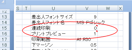 ⑩ 印刷位置の微調整 たとえば年賀状のように、すでに郵便番号枠が印刷されている場合は印刷位置がかなりシビアーです。数字が枠の真ん中に来ない場合は、各シートの V3 V4セルの 上マージン/左マージンを調節して合わせます。