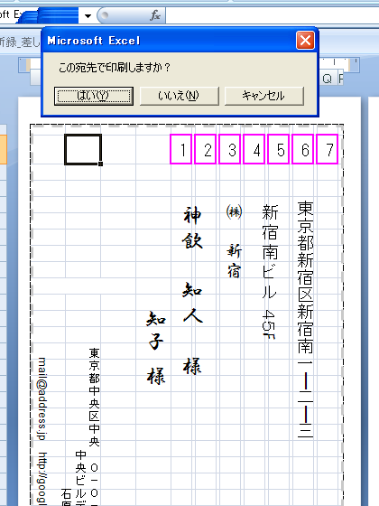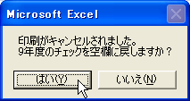 E3セルのチェック年度だけを記入して、H3セルは空の状態で「印刷」ボタンを押すとチェック年度のセルの値に関係なく、指定した開始行~終了行の間の宛先すべての印刷が行われます。また、印刷した宛先のチェック年度のセルに"レ"点が記入されます。(「印刷しますか」の問い合わせに「いいえ」で印刷を中止した宛先には、右のような問い合わせが表示され 「はい」を選択すると"レ"点が付きません。「いいえ」を選択すると「1」が残ったままになります。)