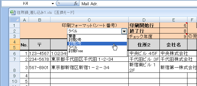H3セル: 「1」を入力しておき、さらに E3セルに入力したチェック年度の幾つかの宛先に「1」を入力しておいてから印刷を実行すると、「1」が入力されている宛先だけが印刷され、空欄の宛先は印刷されません。