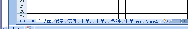このブックは、上のようなシートの構成になっています。このマクロはシート番号を使用しているため「住所録」「設定」「葉書」「封筒2」「封筒3」「ラベル」「封筒Free」までのシートは順番を変更しないでください。間に新しいシートを追加したり順番を変更したりすると動作がおかしくなります。新しいシートを追加する場合は「Sheet2」以降のシートを使用してください。