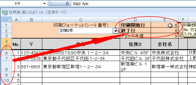 まず、入力した住所録の何行目から何行目までをプリントするのか決めます。