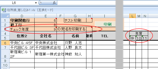 E3セル: チェック年度(L列~N列)の数値を記入します。記入した年度の印刷した宛先には"レ"点が記入されます。