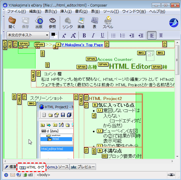 スクリーンショット![]() 上記の HTML Project2 というエディタからの乗り換えに際して、最大の注目点<タグ範囲の表示機能>で検索した結果 ヒットしたタグエディタだが、改めて使い方をマスターして使うほどの魅力は見つけられなかった。 但し、とりわけ大きな不満点があるわけではないので、使い慣れれば 「クセ」の少ない使いやすいツールではあると思う。 |