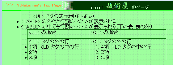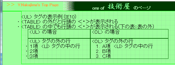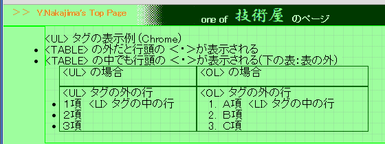 StyleNoteの内蔵ブラウザエンジンは PCにインストールされている IEらしいが、細部で IE(私の環境では Ver.10)とも、Chromeなどとも違っている。気づいたのは <UL> タグの中の <LI> タグの行頭の<・>が TABLE内では表示されなくなってしまうこと。margine-left: 1em 等とすれば表内に入るので表示される。 ![]() StyleNoteの内蔵ブラウザ ・TABLE中の<LI> タグの行頭の<・>が表示されない。 ・(主原因は <!Doctype> のHTMLバージョン宣言部と スタイルシートのミスマッチの場合だが)<div> で上部に固定表示されるように設定した要素(右図の濃緑色部分)が画面下部に表示されてしまう。 下の IE等との違いを参照 InternetExplorer 10PC にインストールされている Internet Explorer の表示: TABLE中の<LI> タグの行頭の<・>は表の外に表示されている ChromeTABLE中の<LI> タグの行頭の<・>は表の外に表示されている FireFoxTABLE中の<LI> タグの行頭の<・>は表の外に表示されている おそらく、内蔵ブラウザでは表の外にはみ出した部分は表示しないようにしているんだろう。 もうひとつ、表のセル幅や 縦位置の表示が一致しない。(★★★) 同一ソースで Chrome (IEも同じ) と比べたのが下図だが、2列の表の右列に更に表を入れ子して、親の表の列に幅を固定値で設定し、子の表は 幅を 100%で指定しているが、何故か親の列幅指定が効かない。どんな値が解釈されているのか全く不明。更に左列に挿入した画像が topではなくて bottom に表示されてしまっている。原因は スタイルシートで table 等に vertical-align: baseline; を設定しているためらしく、HTML側で td要素に valign: top; と指定しても無視されているようだ。 StyleNote 内蔵ブラウザ Chromefigure タグの表示レイアウト(★★★) ![]() 最近気づいたところでは、<figure class="" id="floatright"> <img src="" alt=""> <figcaption class="centertext">画像タイトル</figcaption></figure>( ・・・説明テキスト)のような記述をしても、IE他ではきちんと 画像は右側に、キャプションは画像の下に、説明テキストはその左側に回り込んで表示されるが、StyleNoteの内蔵ブラウザは 左端から順に画像・キャプション・説明テキストの順になってしまい、文字が画像の横に回り込まない。 ![]() <img> タグの中では 同じ id="floatright" の指定を行えば、画像の左側に文字列が回り込む。現時点で気づいているのは <figure> タグの中でフロートを使用した時だけ。 その他、(主原因は <!Docutype> のHTMLバージョン宣言部と スタイルシートのミスマッチの場合なので取り上げるのもはばかられるが、<DIV>で指定した Headerセクションの表示位置が、IE/Chrome/FireFox などはミスマッチにかかわらずページ上部に表示されるのに、内蔵ブラウザでは要素の下部に表示されている(このセルの一番上の図の<one of 技術屋>という部分) strictな解釈と言う意味では StyleNoteが正しいのか?? このように 何点か外部ブラウザと 属性などの解釈の違いがあるようで、レイアウトが正しく表示されないケースが散見される。したがって現時点ではかなり高頻度で外部ブラウザによるチェックが欠かせない。(要は私自身が HTMLタグの細部に自信がないと言うことの裏返しだけど) HTML Project2の時は、IEに限定すれば互換表示されていたので、これほど神経質になることは無かった。 プレビュー画面がリアルタイムに表示されると言う特徴があるだけに、その長所が生きないということで この点は非常に惜しい。 |