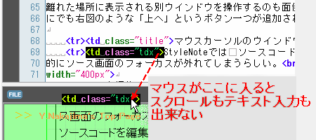 StyleNoteでは ソースコード画面にキーボード入力中でも、マウスカーソルがソース画面外に出ると強制的にソース画面のフォーカスが外れてしまうらしい。