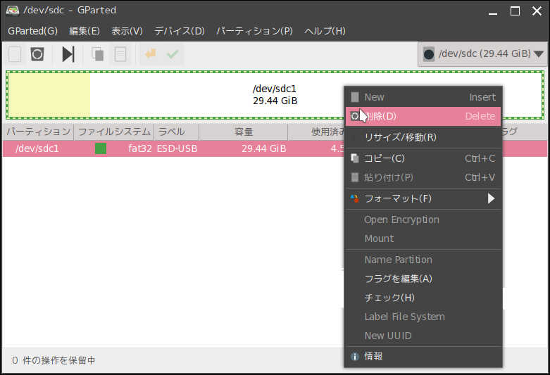 インストール用 USBを起動したら、別の USB端子にターゲット USBメモリを接続して、「メニュー」>「システム」>「GParted」を起動する。