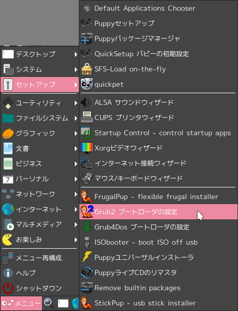 Grub2configがインストールされると、メニュー > セットアップ > 「Grub2 ブートローダーの設定」というメニューが現れるのでこれをクリックする。