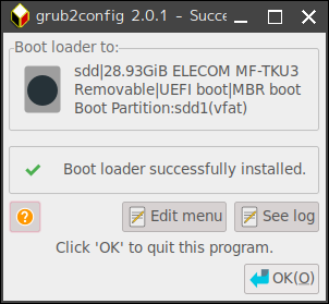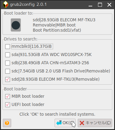 Grub2config が起動したら、Grub2をインストールするデバイス(ターゲット USB)を選択して OKボタンをクリック。