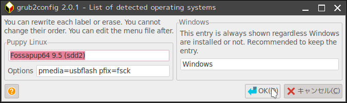 O/S起動メニューに表示される Puppy O/Sの名前を指定。 OKをクリックすると Grub2ブードローダーのインストールが実行される。
