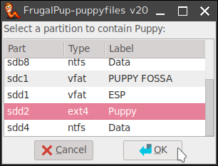 この作業を Puppyのインストールに続けて行わない場合(再インストールの場合など)は、右図のように (このUSBメモリで起動する)Puppy が含まれるパーティションを選択するように促されるので、ターゲットUSBの Puppyをインストールしたパーティションを選択して OKボタンをクリックする。