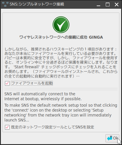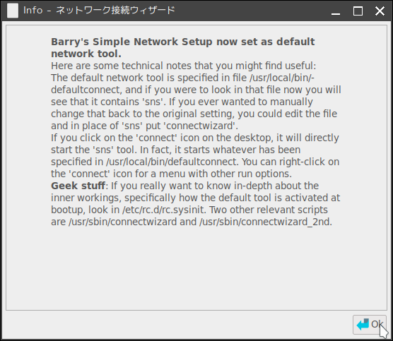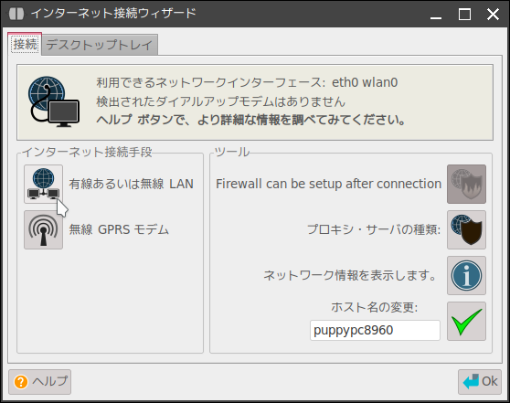 ほとんどの場合、Puppy は イーサネット(LAN)や WiFi などのネットワークデバイスを自動で検出してくれるので、検出された LAN/WiFi デバイスの接続設定を行う。