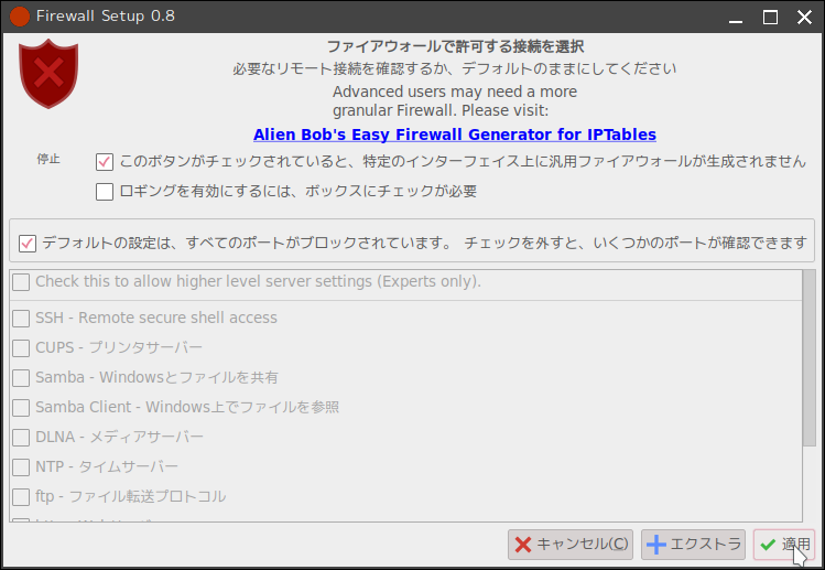 ファイヤウォールの設定画面が表示されるので、通常はそのまま「適用」を押せばいい。