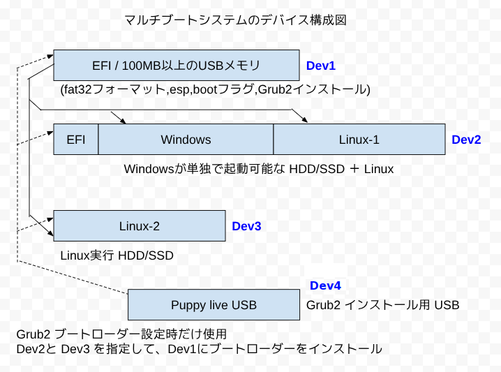 まず Grub2のインストールが実行できる Puppyなどの O/S(Dev4)から起動しておいて