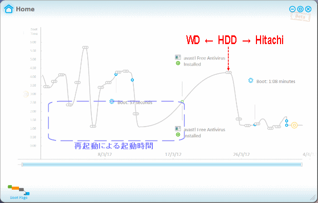 ほとんど使っていない 2ndマシンに、Hitachiの 7200rpm、1TB HDDの HDS721010 を搭載していたことを思い出した。Hitachiはアクセス音が独特な「ドコドコ」という感じの低音で何となく TV録画の時に気になっておりメインマシンには使わなかったが、上記の WDの低温特性で考え直して換装してみた。3日ほど運用してみたところ 今朝の起動時に何と 1分を切って 58秒という起動時間を計測した。しかも、下の Solutoの履歴グラフでわかるとおり 起動を繰り返すたびに着実に時間が短縮されていることが分かる。これは O/Sの Prefetchや起動ファイルの再配置などの起動時間改善機能が正常に働いて時間が短縮しているようにも思えるが、WDの時には低温起動時と再起動時でアクセススピードが違いすぎて正常にフィードバックがかからなかった可能性と、ばらつきが大きすぎてこの程度の差は埋もれて表面化しなかったような気がする。