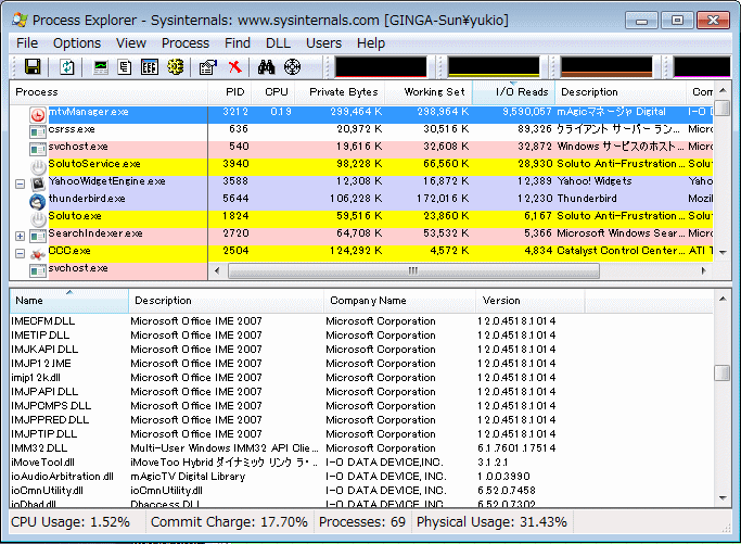 | プロセスごとの CPU使用率、HDD転送量などをツリー状に表示するツール。上位のプログラムから下位のプロセスまでがツリー状に表示されるのでわかりやすい。 | |||