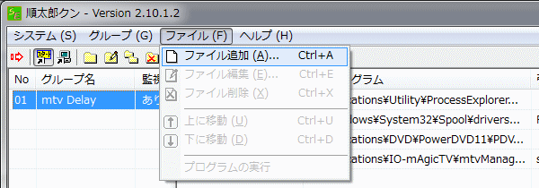 次に、上記で作ったグループに実行プログラムを登録していく。「ファイル」メニューの「ファイル追加」を実行する。
