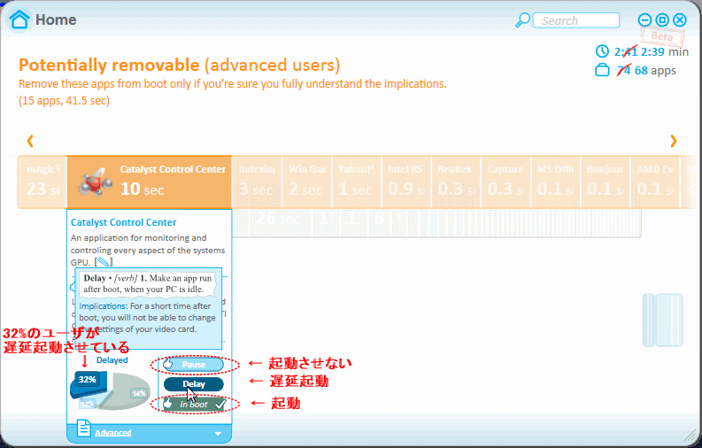 緑色のバーが、「オススメ」で自動起動を外していいサービスでこれを外せば 0.4秒縮まることが分かる。橙色のサービスは「かなり外せる可能性がある」サービス、灰色は Solutoが外せないと判断したサービス。下の右端に並んでいる青い帯は既に起動時には外してしまったサービス(Solutoの設定で「Pause」したものだけ)。