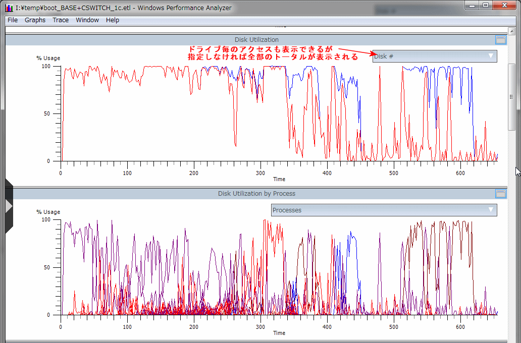 下の図はそのグラフの中 全てのディスクアクセス(上)と、プロセス毎の個別のディスクアクセス(下)を表示したもの。恐らく 下の細かな個別のグラフのトータルが上のグラフになっていると思われる。