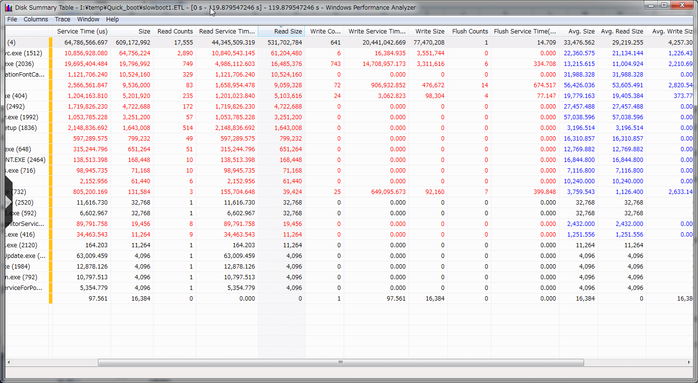 Quick は再起動時、Slow は朝一番の起動時のトレース結果のトータルで、起動後 2分までに読み込まれるサイズ合計の比が、再起動では朝一番の 1.5倍程度になっており 朝一番の起動時の HDDアクセスが遅いことが裏付けられた。