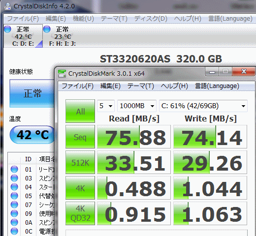 Crystal DiskMark というベンチマークツールを使って、起動直後に HDDのアクセススピードを計ってみると Read も遅いが Writeが更に遅い。しかし測定中に温度は HDDの自己発熱で徐々に上がるので、O/Sの起動が遅い上に1ラウンド 5分以上の測定を繰り返すと 2度目の途中くらいからスコアが上がり始める。同じ作者の Crystal DiskInfoという HDDの情報表示ツールでS.M.A.R.T情報を表示させて温度を見ながらベンチをとると、18℃あたりから性能が変化して正常値になるようだ。