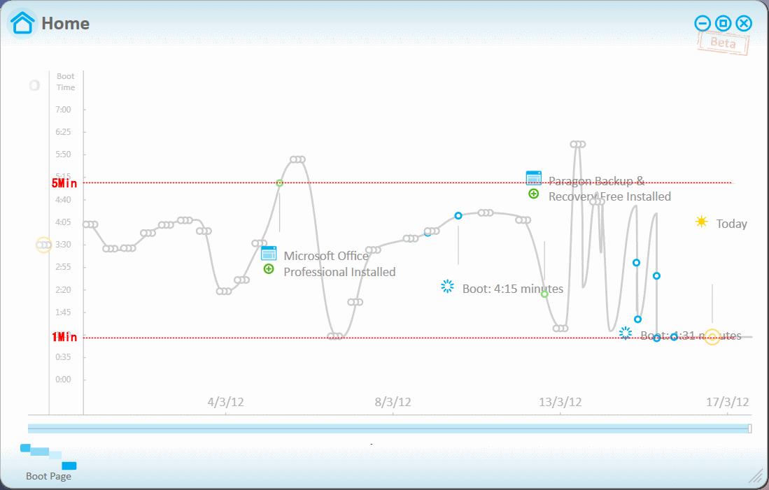 Soluto という起動時間の測定・記録ツールを使って起動時間を測定すると下の図のように、朝一番の起動と、その後の再起動の時の起動時間が 5分~1分の間でバラツクのが分かる。但し、下図のグラフは縦軸(起動時間)のスケールが結構いい加減で、5分を超える時間は2回しかなさそうに見えるが詳細表示させると実際は 6分を超える起動時間が2回、その外も朝の起動時は すべて 5分を超えている。